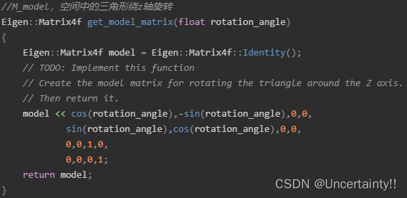 此例中将空间中三角形绕z轴旋转,每一次按键A则左旋10度,每一次按键D则右旋10度