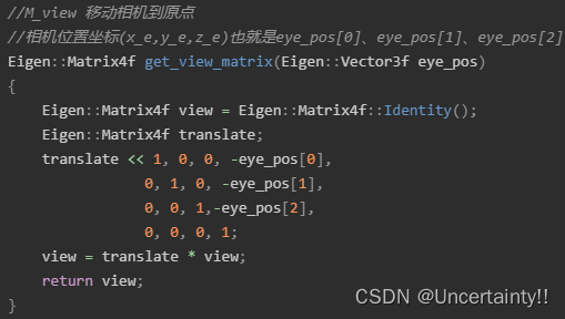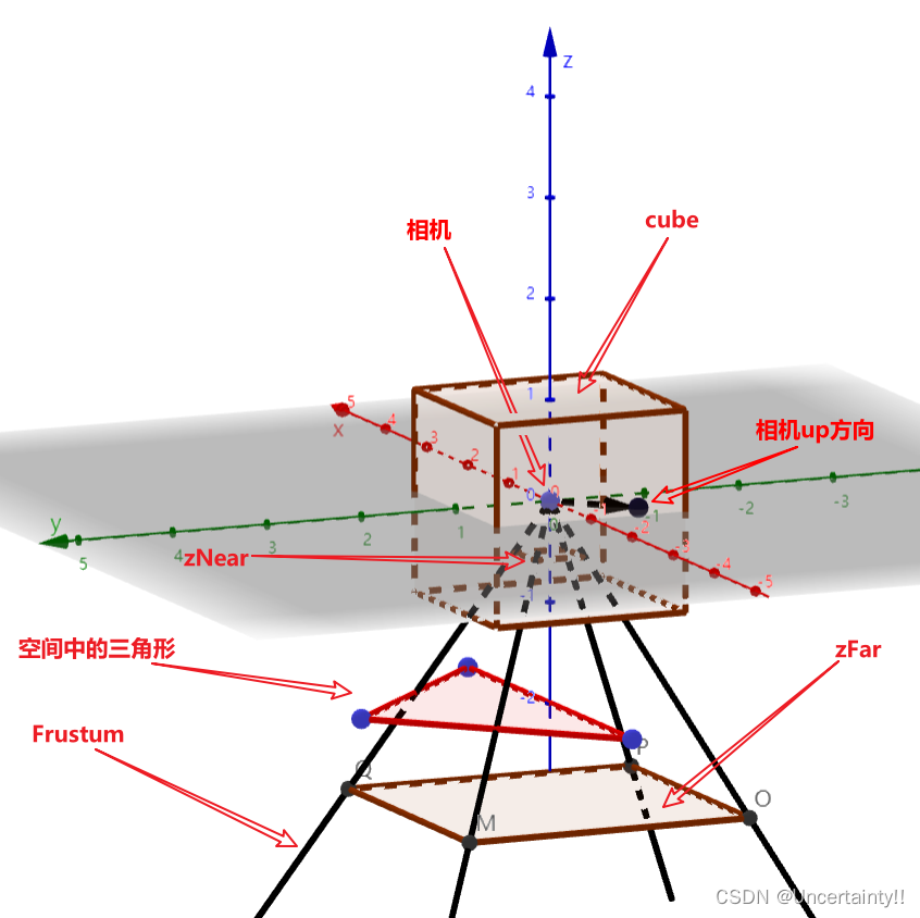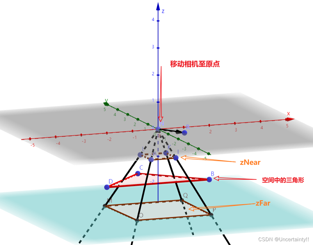 此例中相机初始位置为(0,0,5)【备注:详见主函数中输入的值】经过 M view M_{\text{view}} Mview将相机移动到原点且相机方向朝向z轴负向,zNear与zFar均为负数