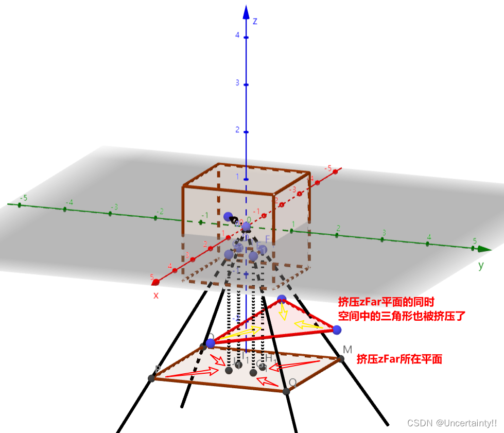 挤压过程中zNear平面不变,即近处画面不变,zFar中心点位置不变,zNear与zFar之间的所有物体均被挤压