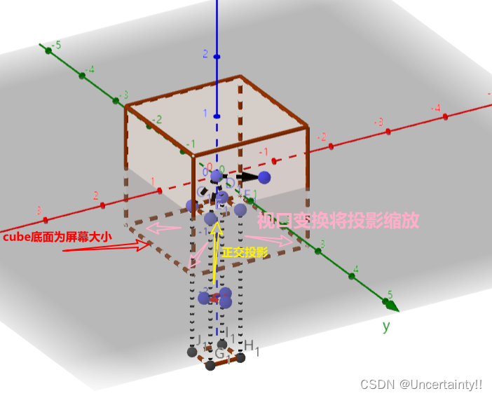 空间中的物体透视投影后,经过视口变换,将其投影缩放到与屏幕相适应的大小