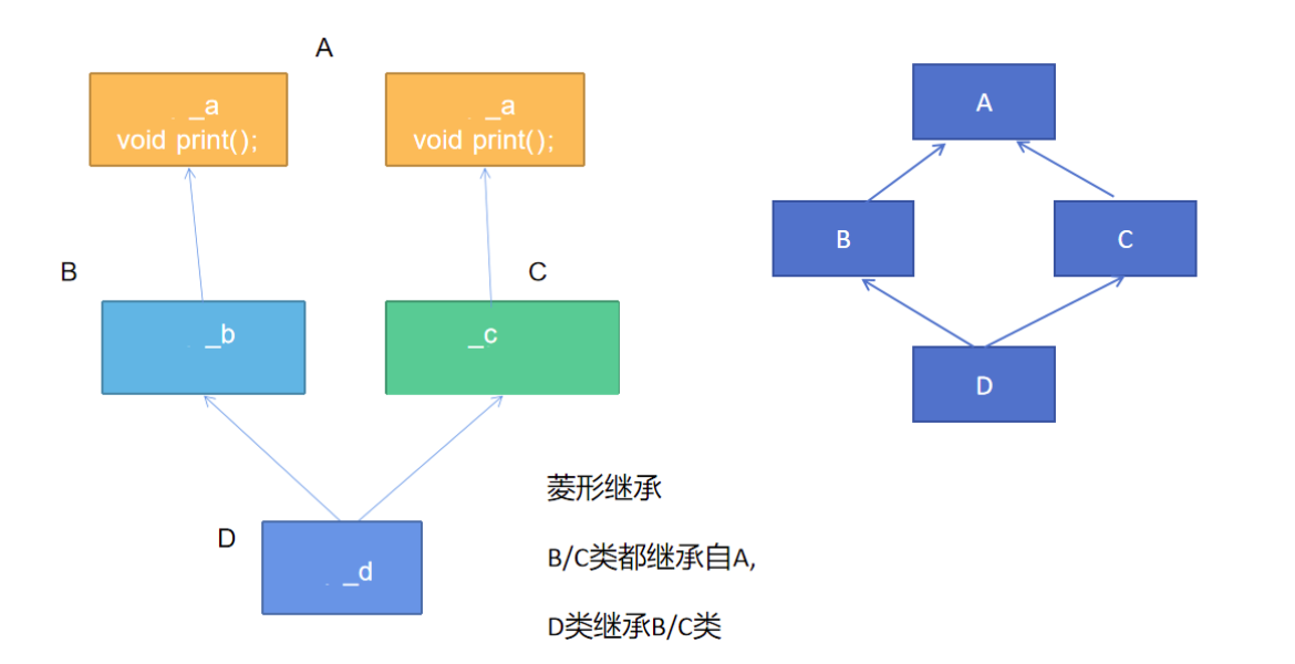 继承中的隐藏是编译器的名字查找规则导致的:当在派生类中查找某个名称时,编译器会先在派生类内部查找,找到后就停止向上查找基类的同名成员。这一机制可能导致意外屏蔽基类成员,因此实际开发中应尽量避免在派生类中定义与基类同名的成员(除非有意隐藏)。多继承的核心是让派生类同时拥有多个基类的功能,但也可能带来菱形继承(需用虚继承解决)和成员名冲突(需显式指定来源)等问题。实际开发中应谨慎使用多继承,优先考虑组