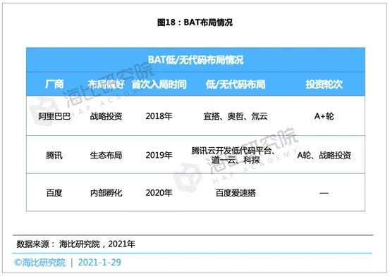综上,阿里于2018年5月首次入局低/无代码领域布局,以战略投资为主,被投企业与阿里体系内部产品打通,与合作伙伴共同提供业务咨询及服务。腾讯于2019年7月首次入局,主要以生态布局为主,与合作伙伴共同联合开发产品,面向垂直行业的解决方案。百度于2020年底以内部孵化产品——百度爱速搭的形式入局。至此,BAT全部入局,在低/无代码领域开始发力,力求在竞争格局尚未形成的市场分一杯羹。