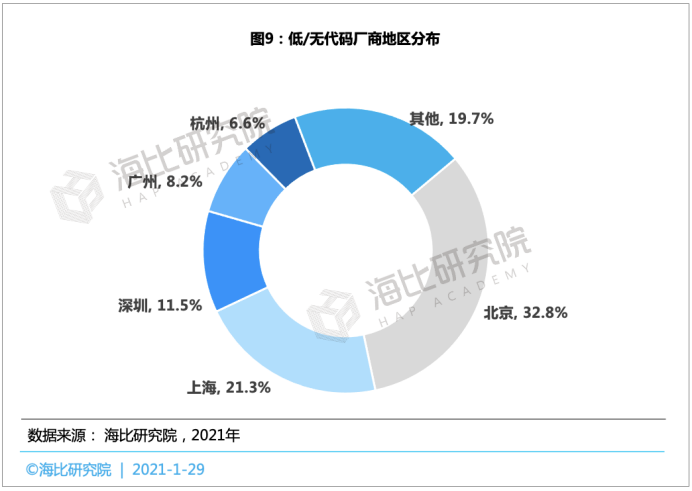 据海比研究调查,目前市场上共有低/无代码厂商近70家。从各类型平台商的数量分布来看,场景应用型数量最多占比达57%,其次是产品研发型、平台生态型和技术赋能型。平台生态型和技术赋能型虽然数量不多,但却是未来重点发展方向。