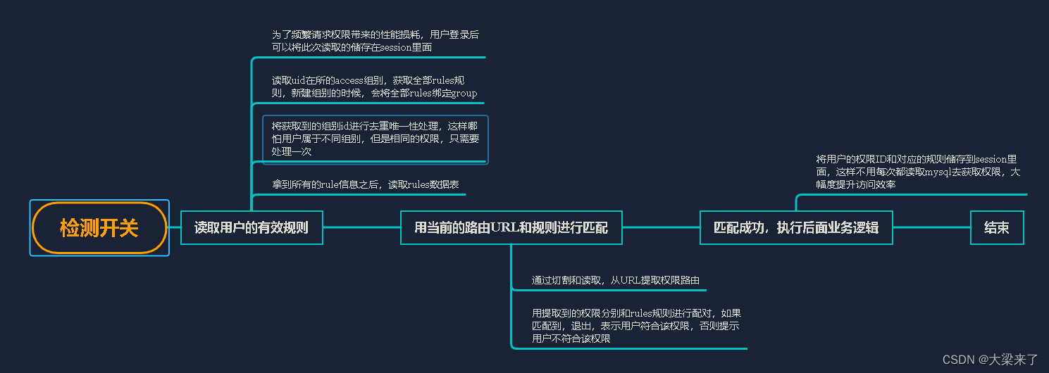 将用户的权限ID和对应的规则储存到session里面,这样不用每次都读取mysql去获取权限,大幅度提升访问效率