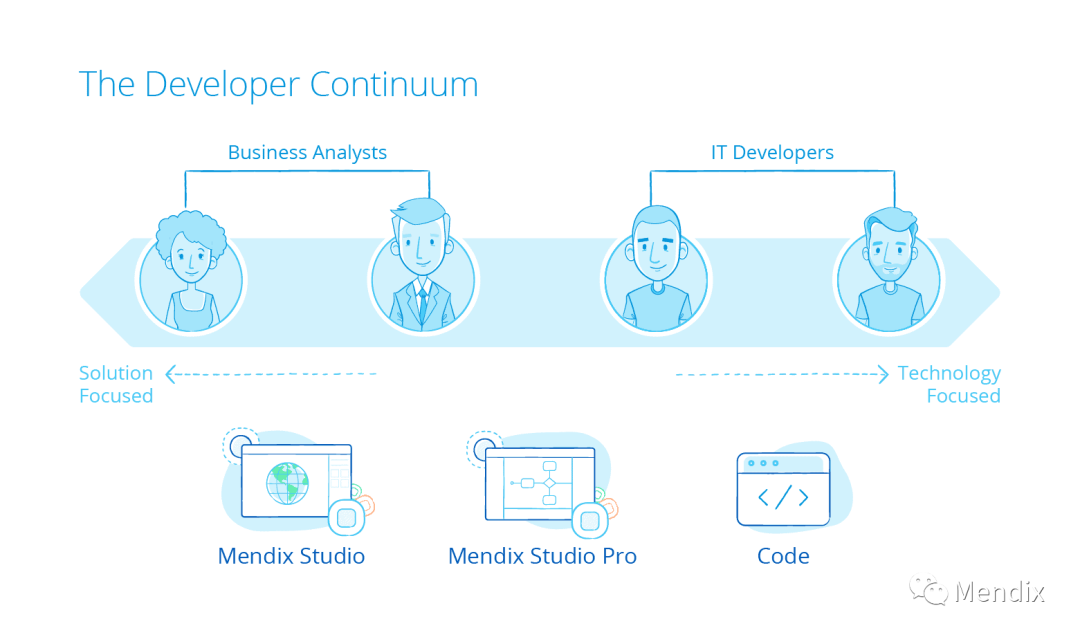 业务分析师和公民开发人员(Business Analysts and Citizen Developers)可以直接使用Mendix Studio,入门仅需几分钟。如果需要添加更多高级应用程序功能,则熟悉Mendix Studio的用户也可以开始使用Mendix Studio Pro,或者让专业的开发人员使用Mendix Studio Pro协助添加这些高级功能。Mendix Studio和Mendix Studio Pro共享相同的概念和术语,从而提供了流畅的协作体验。