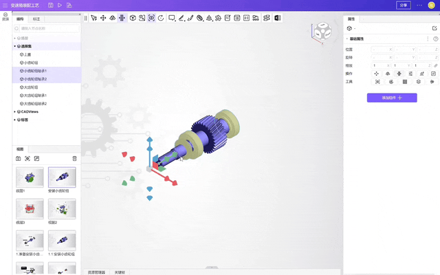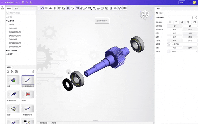 在3D工艺大师中,用户完成爆炸、剖切等效果后,无需切换软件,即可自动生成过渡动画。这些动画以平滑且自然的方式呈现模型位置、旋转、缩放、材质、可见度等属性的变化,使装配过程更直观易懂。