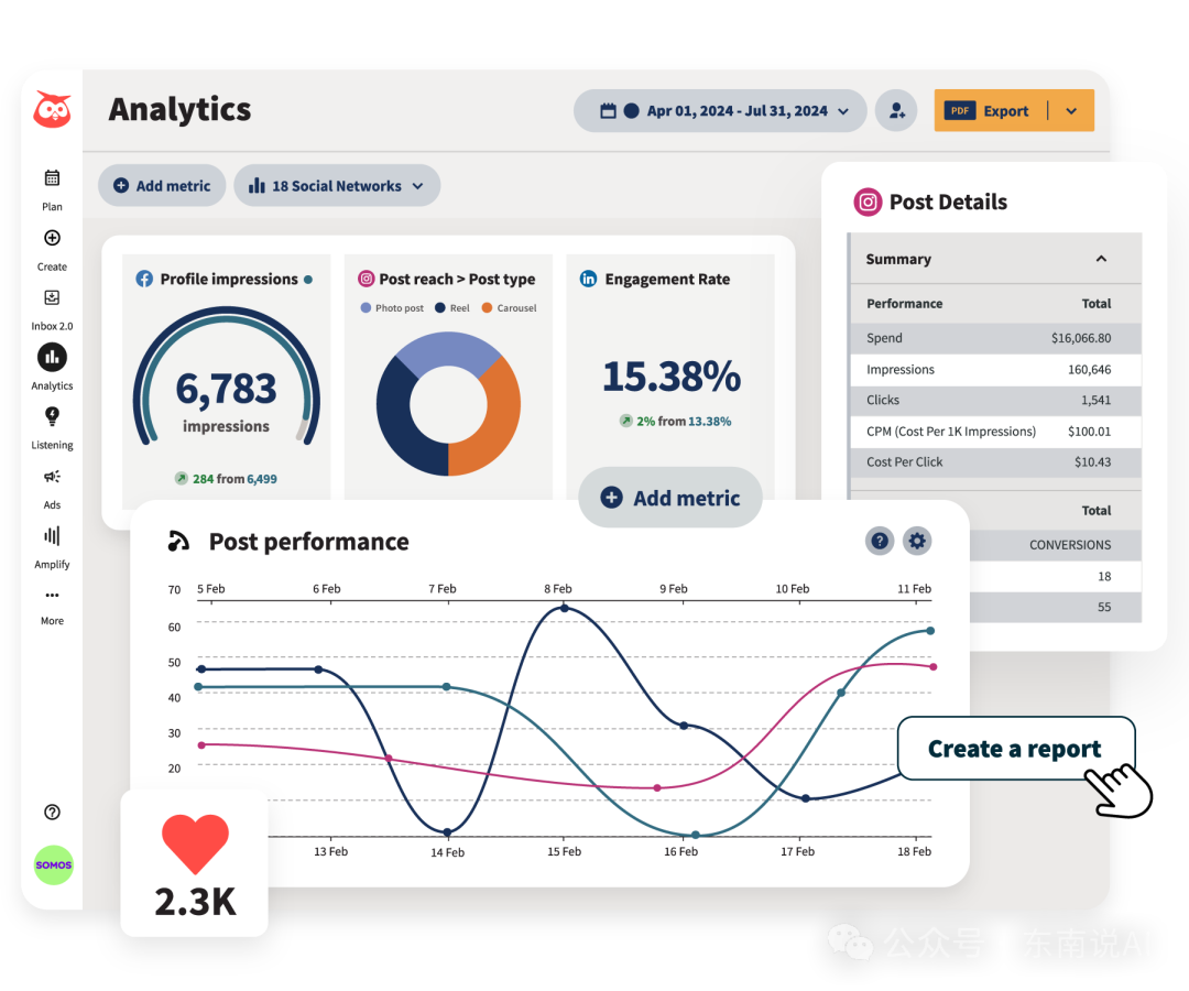 除了常见的排程、分析功能,它还支持白标报告与客户账户管理,适合外包营销团队或运营代管公司使用。