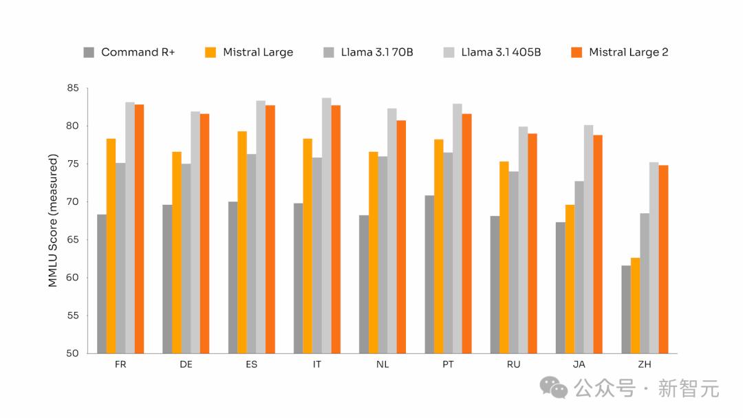 比如,在法语、德语、西班牙语、意大利语、葡萄牙语、荷兰语、俄语、中文、日语、韩语、阿拉伯语和印地语等多种语言上,Mistral Large 2都有出色的性能。