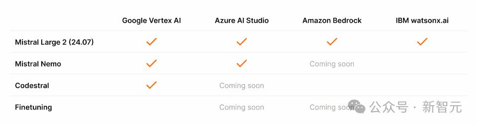 Vertex AI、Azure Studio等第三方云平台也托管了Mistral Large 2的API。