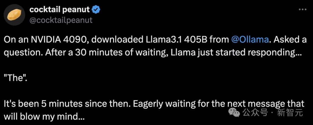 比如昨天刚发布,就有一位勇敢的推特网友亲测,用一张英伟达4090运行Llama 3.1。