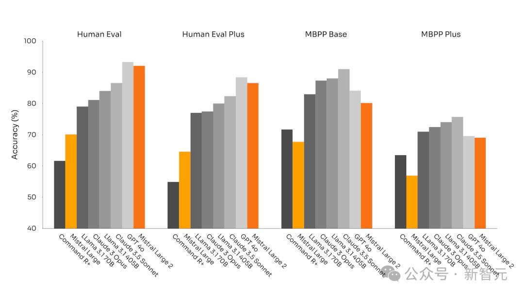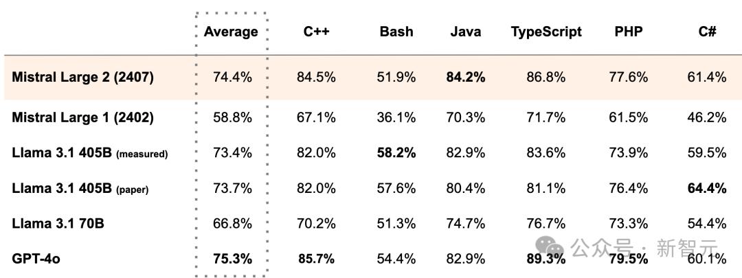 在MultiPL-E基准上,Mistral Large 2的平均生成准确率领先Llama 3.1将近1个百分点,而且可以媲美GPT-4o。
