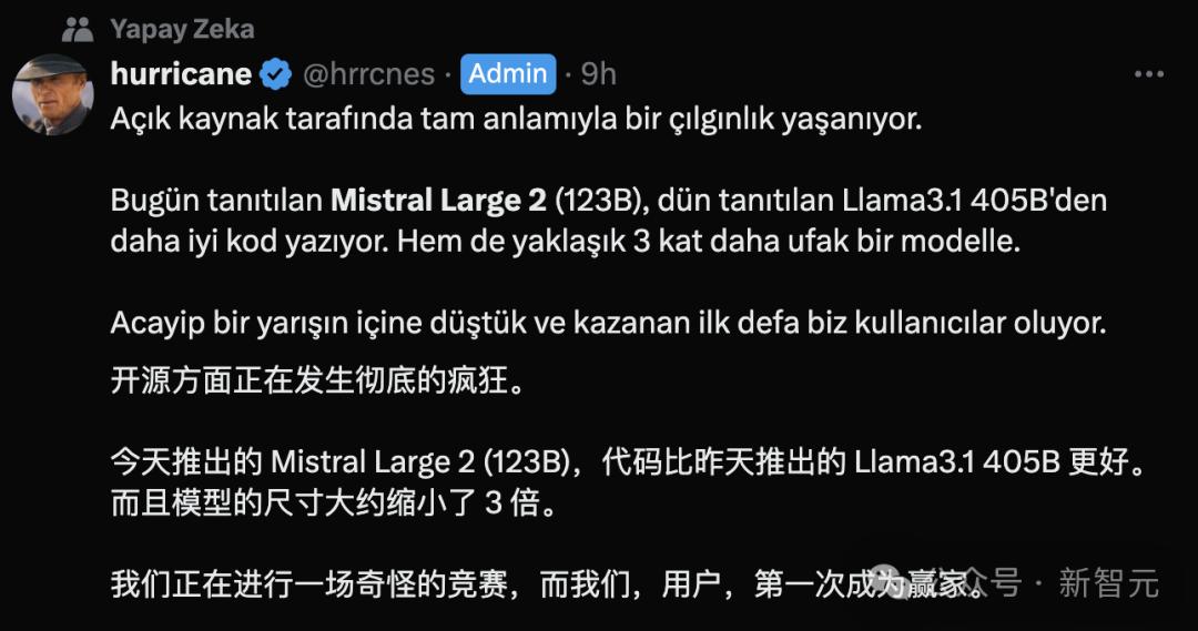 【新智元导读】紧跟着Meta的重磅发布,Mistral Large 2也带着权重一起上新了,而且参数量仅为Llama 3.1 405B的三分之一。不仅在编码、数学和多语言等专业领域可与SOTA模型直接竞争,还支持单节点部署。昨天正式发布的Llama 3.1模型,让AI社区着实为之兴奋。但是仔细一想就能发现——405B的参数规模,基本是没法让个人开发者在本地运行了。比如昨天刚发布,就有一位勇敢的推特