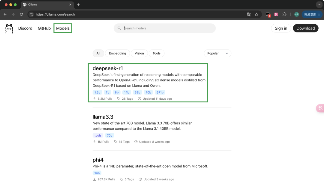 打开浏览器,访问 Ollama 官网,切换到官网的 “Models” 页面。
