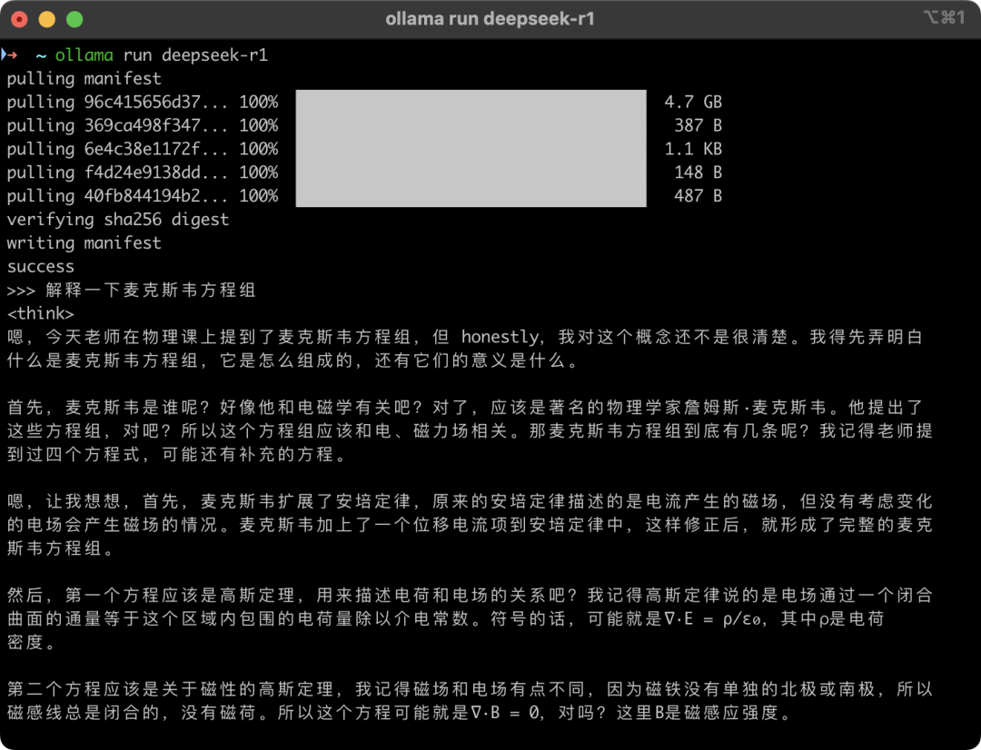 当安装完成的那一刻,你就可以开启与 DeepSeek-R1 的对话之旅。在命令行终端中输入ollama run deepseek - r1:7b(这里的参数根据你实际下载的模型参数而定),然后输入你想要询问的问题或指令,即可体验它强大的语言处理能力和智能交互功能,探索无限的 AI 应用可能。