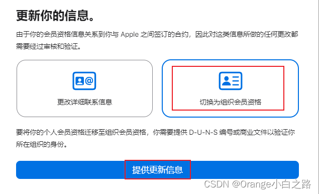 5.选择切换为组织会员资格,点击提供更新信息按钮