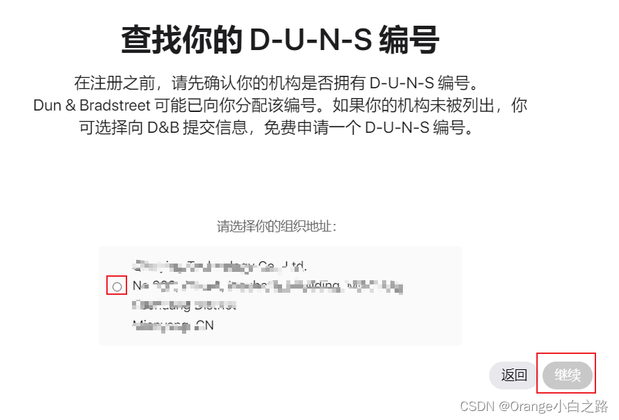 7.如没有查找到DUNS编号,则勾选刚填写的公司信息,点击继续按钮