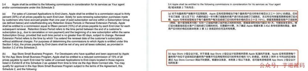 而《付费 App》协议则明确了分成比例,即大家熟知的30%抽成,以及可能不是每个人都了解的自动续订超过一年后降至15%的分成比例。此外,对于小型企业,分成比例也降低为15%。