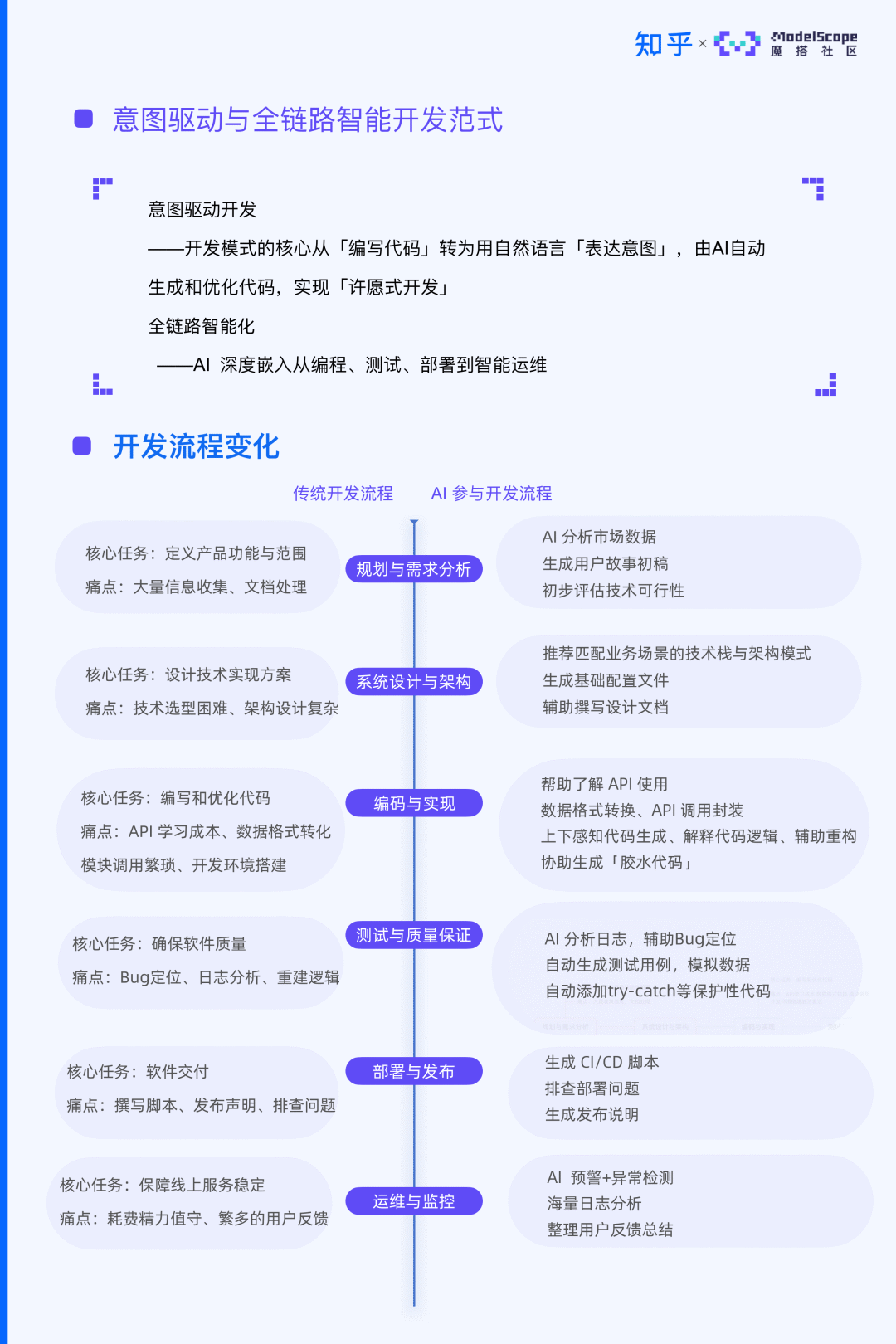 魔搭社区作为核心开源平台,汇聚超12万个开源模型、5500+MCP服务,超2000万用户在此完成模型调用、二次开发与应用落地,近95%的应用由个人开发者完成,赋能智能制造、公共服务等20多个行业。“超级开发个体”崛起,AI成为能力杠杆,帮助开发者突破技能短板,独立完成产品从0到1的全流程。知乎与魔搭社区联合发布的《2025年AI时代开发者生态白皮书》显示,AI技术正重塑开发范式与开发者生态,中国A