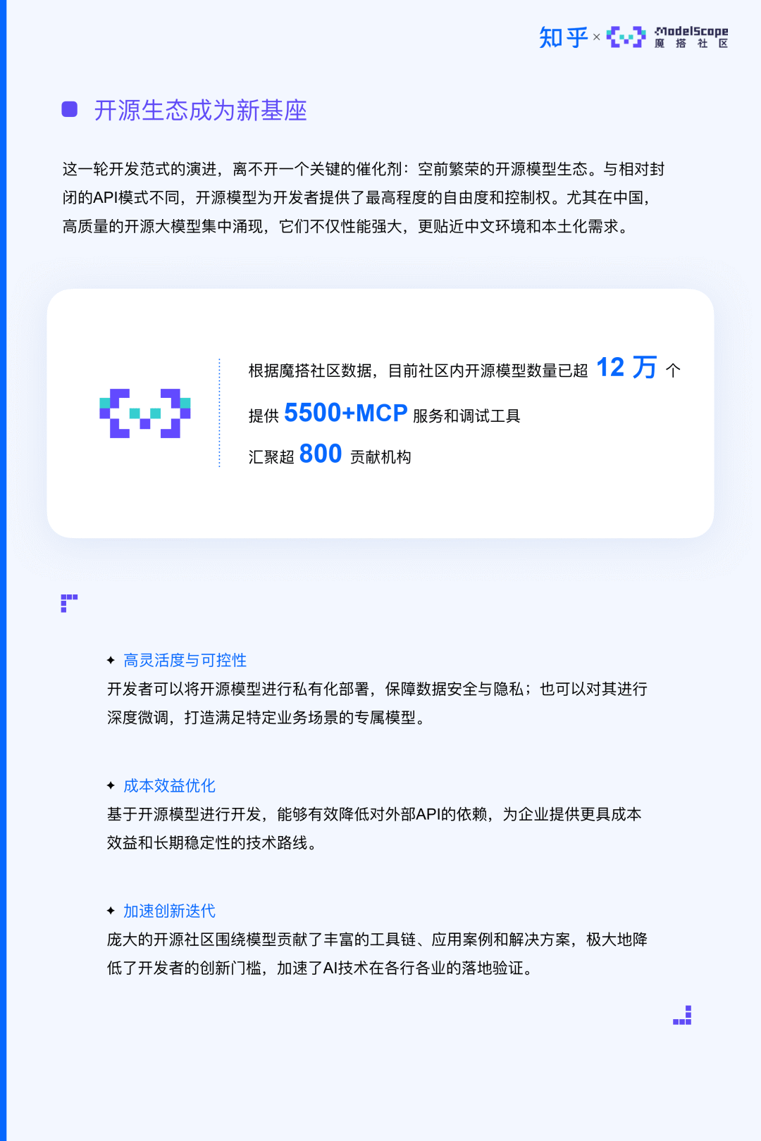 社区成为认知核心,开源生态构筑创新基座。开发者信息获取注重“即时性”与“实用性”,优先通过官方论文/网站获取一手信息,知乎等专业社区成为深度交流与认知迭代的关键平台。知乎聚集1600万科技互联网话题参与者,78%的资深开发者从信息消费者转变为内容共创者,形成产学研多元视角的交流生态。魔搭社区作为核心开源平台,汇聚超12万个开源模型、5500+MCP服务,超2000万用户在此完成模型调用、二次开发与应用落地,近95%的应用由个人开发者完成,赋能智能制造、公共服务等20多个行业。
