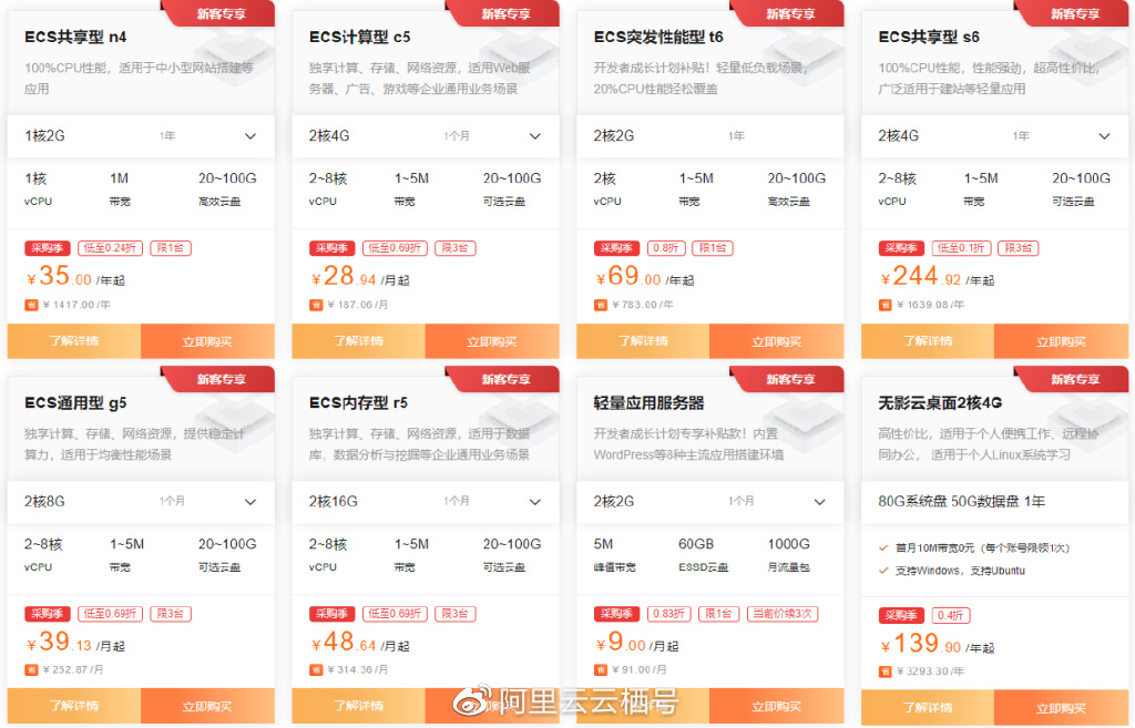 在选购云服务器时,我们要选择服务器的地域可用区、规格实例、操作系统、硬盘大小、带宽大小、安全组等配置。ECS共享型 n4、ECS突发性能型 t6等产品,新人用户一年只需要几十块就可以拥有。