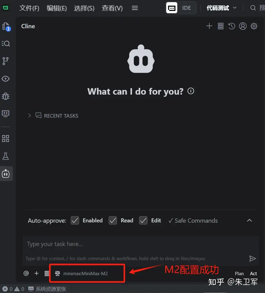 配置好后,在Cline对话界面显示出M2模型就代表成功了,如果不放心,最好是问候它一句,有回应就可以正式使用M2。