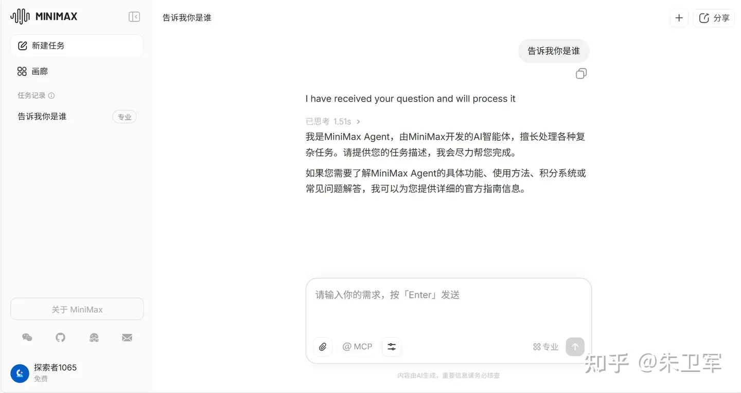 现在大模型产品形态都是通用模版,和Claude、Deepseek等同类产品一样,MiniMax提供了三种方式来使用M2,如果只是用AI办公,写写脚本,可以在网页端或者APP里使用。