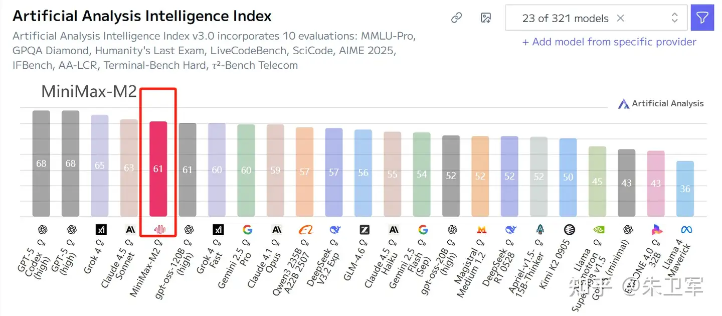 在Artificial Analysis榜单看到空降一个新成员,MiniMax公司的M2模型一下子跻身前五,仅次于sonnet 4.5。