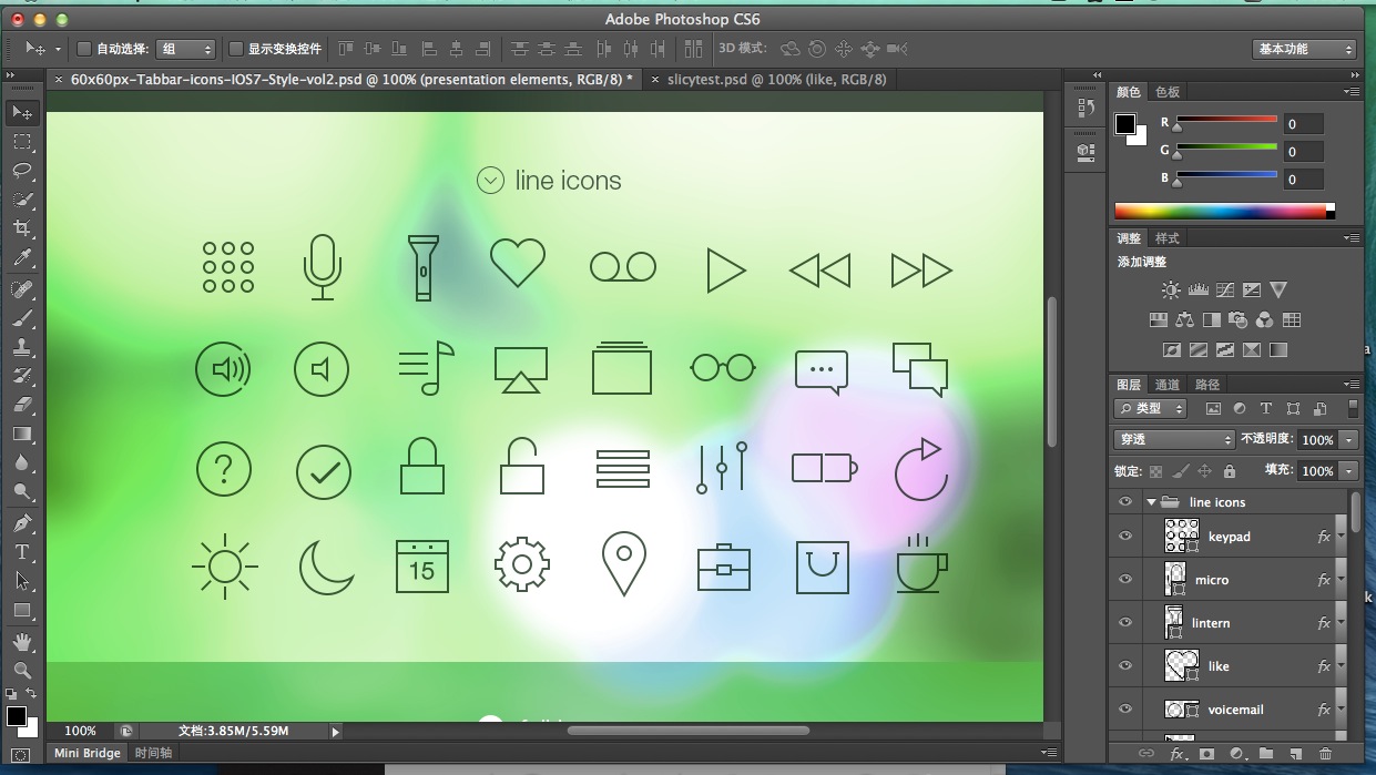 step2:重命名图层。以like图层为例,它所对应的图标是第1行第4列的桃心。如果我们想要保存为.png格式,并且加上@2x后缀,则直接双击图层名字,改为like@2x.png。其他图层都要修改名字,名字不必一致。结束后保存psd