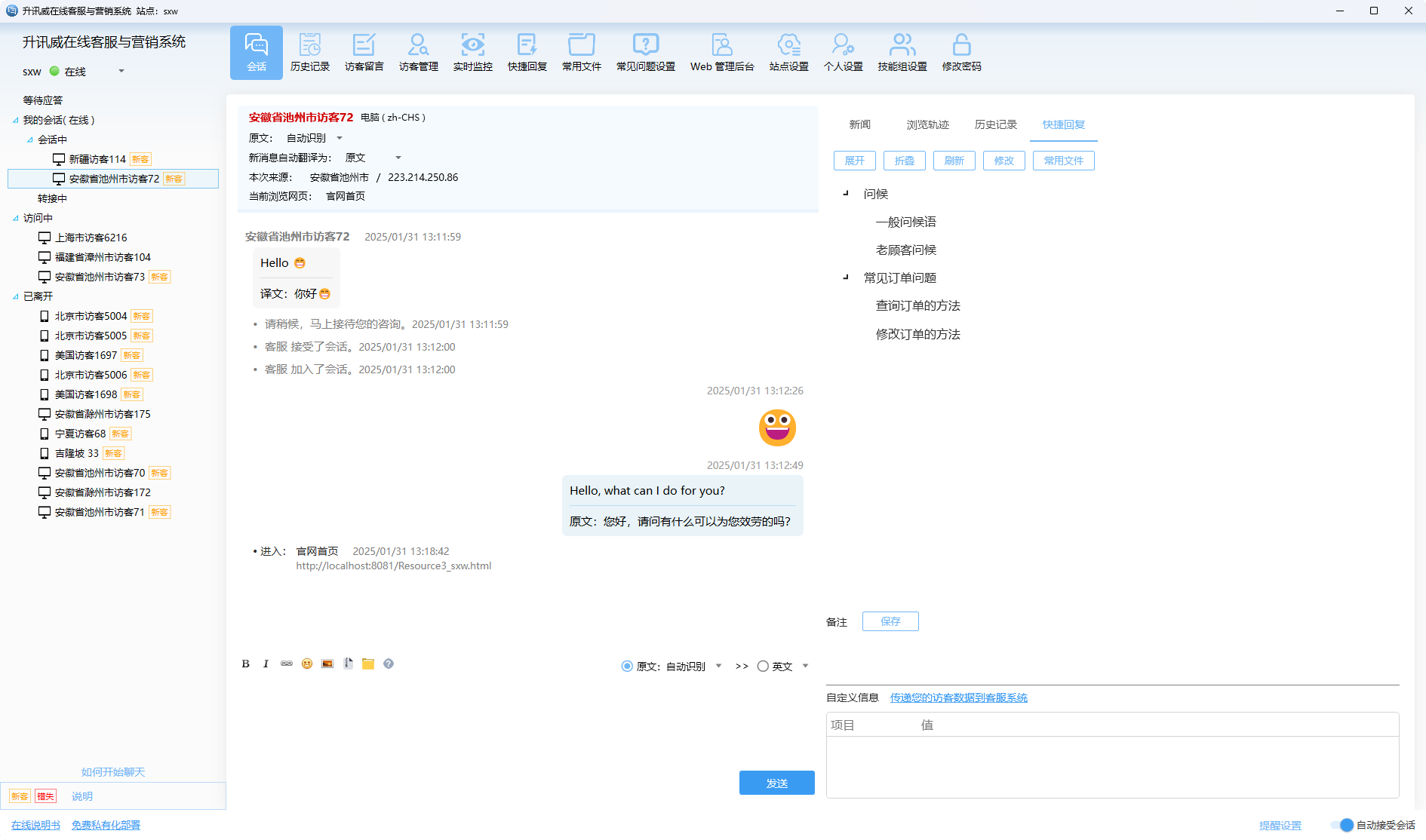 客服端是客服人员的作战平台,我们构建了一个专注、高效、响应迅速的桌面级体验。系统采用多标签会话设计,让客服可同时处理多组对话;访客轨迹、历史会话、地理位置、设备信息、来源渠道等关键信息一目了然,协助客服快速做出判断。内置快捷回复、常用文件、表情支持和智能推荐功能,大幅降低重复劳动成本。同时,系统还支持智能分配、会话转接、转人工、自定义状态等多种机制,保障团队协作流畅,让客服不仅能应对高峰,更能稳定交付满意度。