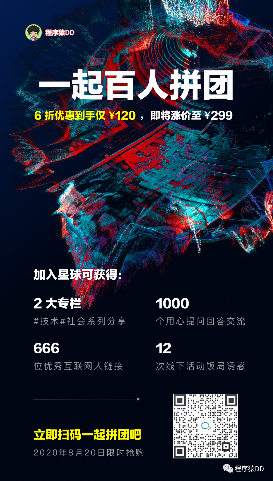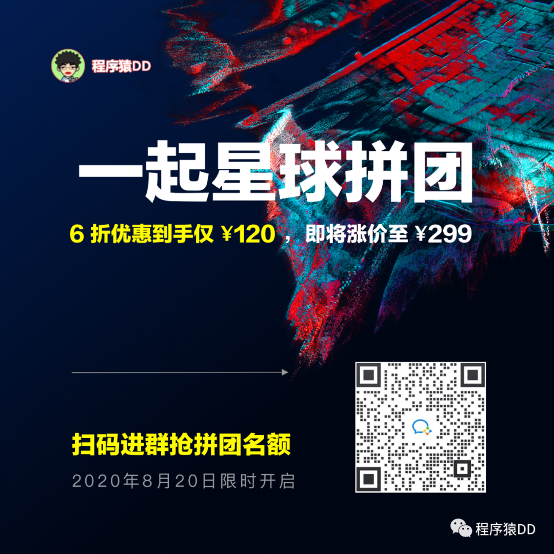对了,很多朋友错了以前加入星球优惠,问我还有优惠吗?其实我的星球价值远远超过了门票。刚好,8 月会员日活动,组织了个百人拼团活动。如果你想上车,赶紧通过下面海报加入: