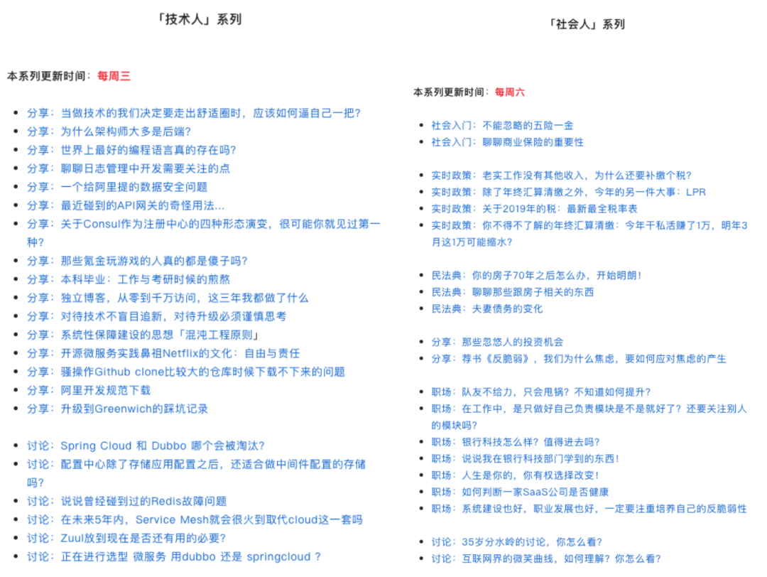 所以我在做「程序猿DD」社群时候,想着产品差异化和心智,给社群定了几个指标。其中一个指标就是心智打造 - 坚持每周三六固定会有专栏,原创干货分享。意味着社群里面与时俱进,未来的时候,这些分享也紧跟着潮流走。
