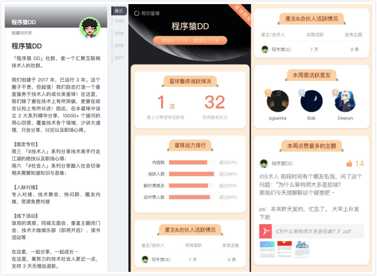 关于知识星球「程序猿DD」,创建于 2017 年,已运行 3 年。每月基本都是互联网技术星球活跃 TOP 10。我们认为这是一个汇聚互联网技术人的社群。其实社群,我把它当一款产品,去研发,去考虑用户+内容+活动运营等等。比如让用户在这里有链接,有成长,都需要我去思考。这和以前做开发不一样,这些都需要我去策划,我从来没有做过运营,但现在每个分享,每个活动设计都需要我去思考和实践。