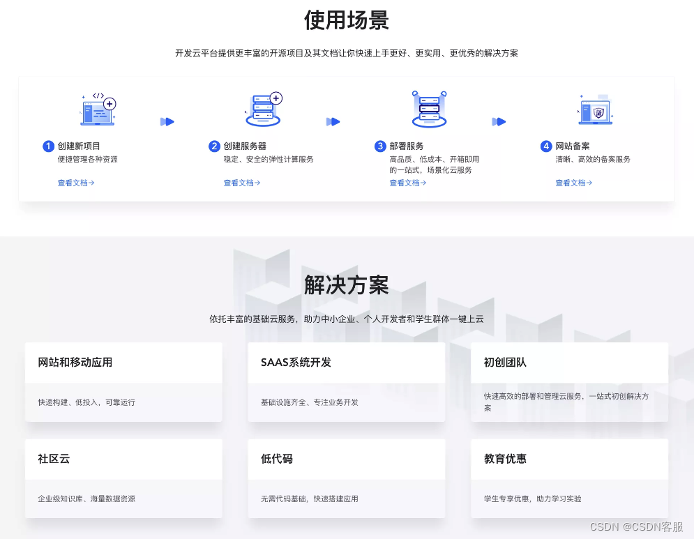 CSDN开发云背靠CSDN社区海量的数据资源,提供专业的开源项目及其文档,依托丰富的基础云服务,覆盖创建新项目、创建服务器、部署服务、网站备案等多场景,提供网站和移动应用、SaaS系统开发、初创团队、社区云、低代码开发、教育优惠等多样化解决方案。
