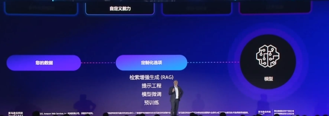 第二点是模型定制能力。将自己的数据引入模型,是释放 AI 价值其中最重要的一步。现在 Amazon Bedrock 支持端到端的全托管 RAG 功能。该功能允许企业直接将模型与内部数据源(如数据库、文档库)安全连接,无需自行搭建复杂的检索管道,即可生成基于企业私有数据的精准回答。