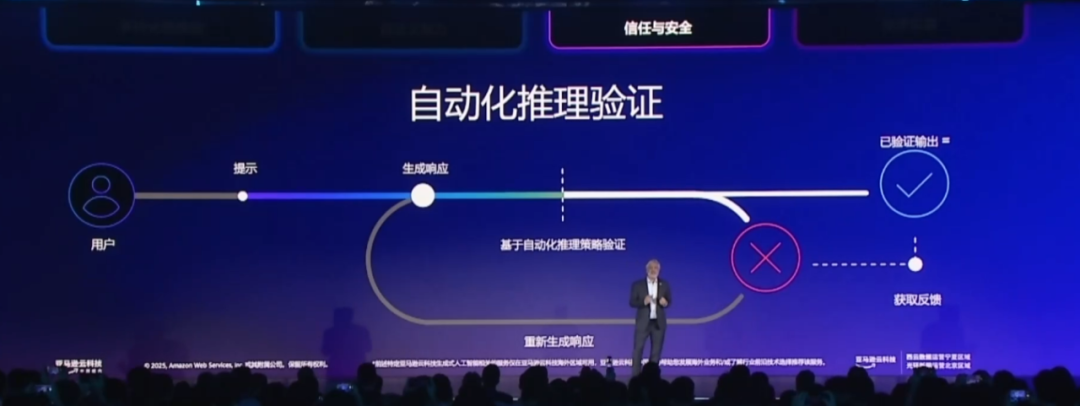此外,为了解决大模型幻觉现象,Bedrock Guardrails 率先推出了自动化推理(Automated Reasoning)功能,其中 Reasoning Checks(推理校验)能基于逻辑验证和可证明的依据,有效防止生成式 AI 出现事实性错误和幻觉内容。目前,只有亚马逊云科技提供这一功能。