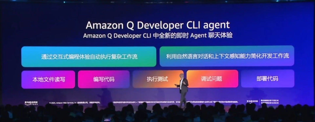 另外,很多开发者更喜欢通过命令行工作,因此亚马逊云科技发布了全新的 Q Developer CLI Agent。它能结合 Q Developer CLI 环境中的信息,执行读写文件、编写代码、自动调试等任务。
