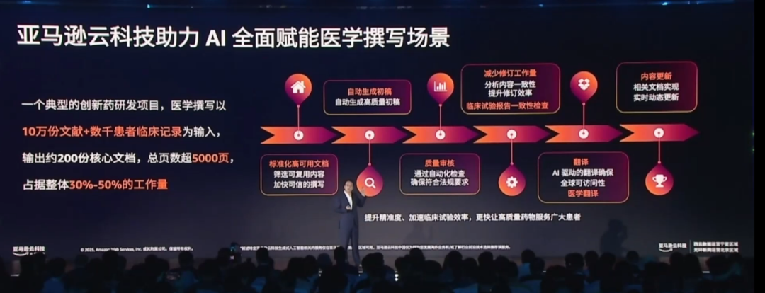 针对这一挑战,复星医药和亚马逊云科技展开了合作,将整个医学写作的场景进行了解构。借助生成式 AI 的能力,一键式完成实验报告检查,把长达一周的工作缩短到 5 分钟。另外,在医学翻译领域,借助亚马逊云科技技术,复星医药用 6 个月的时间已经完成了 1.6 个亿字的翻译,直接降本超过了 30%。