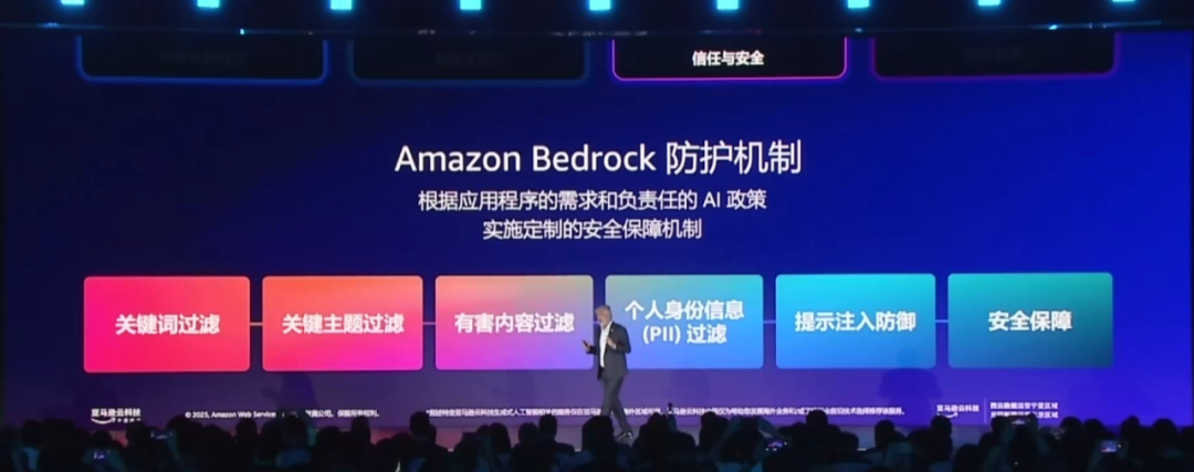 第三点是信任与安全。这是所有生成式 AI 应用的核心。Amazon Bedrock 提供的 Guardrails(安全护栏) 功能,可以帮助用户屏蔽有害或不合规的输入与输出,并且这些 Guardrails 是可以继承的。