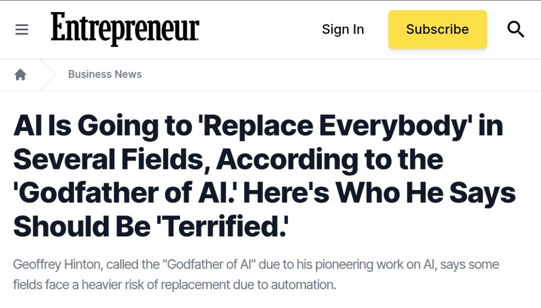 诺贝尔奖获得者、AI 先驱 Geoffrey Hinton 表示,人工智能将在多个领域「取代所有人」,只有顶尖技能人才能够找到 AI 无法处理的工作。