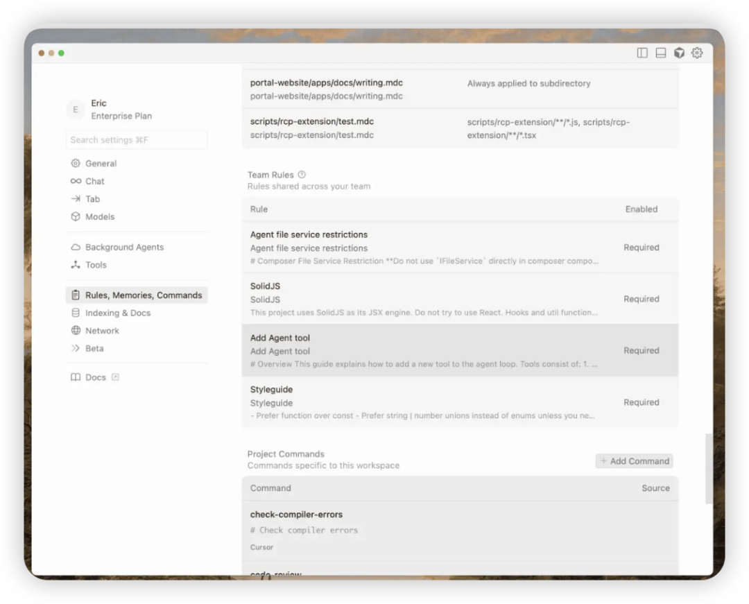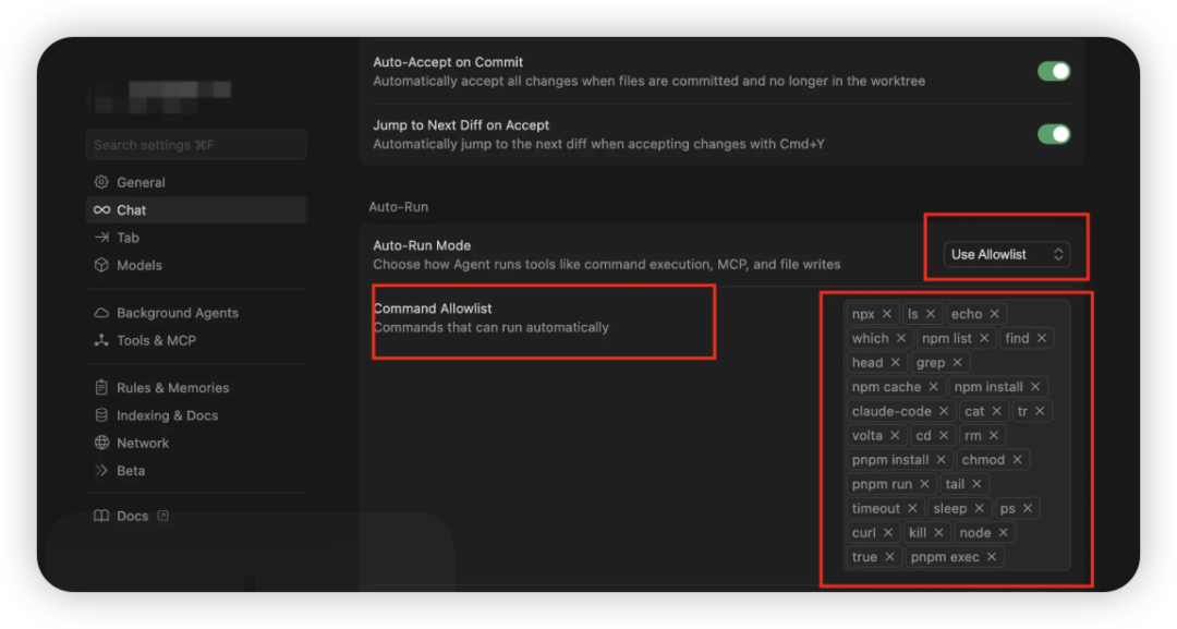 若处于允许列表模式,未在允许列表中的命令将自动在沙盒内运行,该沙盒可对您的工作区进行读写访问,但无法访问互联网。无论你是独立开发者还是团队协作者,Cursor 1.7 的这些新特性都将显著提升你的开发效率,让 AI 真正成为你的得力助手。允许列表模式是cursor早期的功能,具体配置如下,或者你在agent交互过程中,已经设置了部分允许列表。当你在 Agent 输入框中打字时,系统会根据你最近的代