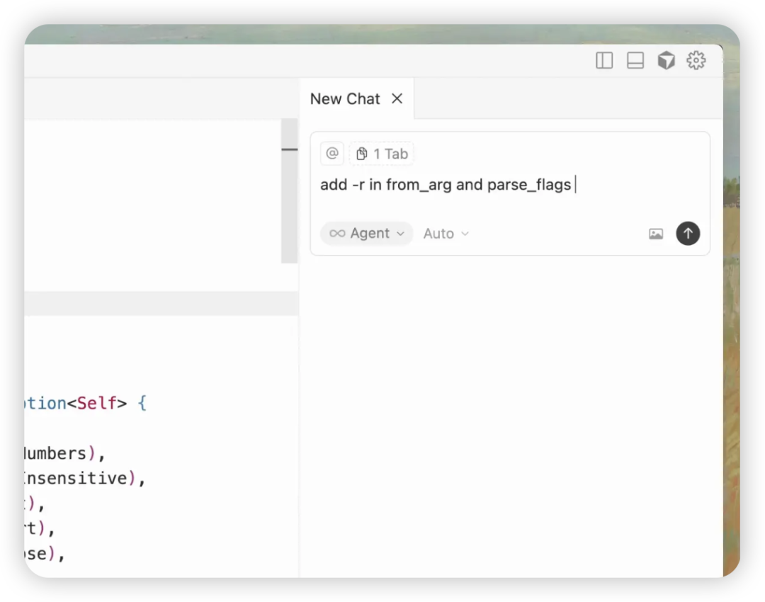 Agent 提示词智能自动补全 是本次更新的最大亮点!Cursor 将其最引以为傲的 Tab 自动补全能力(业界公认最强)引入到了 Agent 对话中。现在当你和 Agent 对话时,它会根据你最近的代码修改,预测你想说的话并自动补全——这简直就是"读心术"!