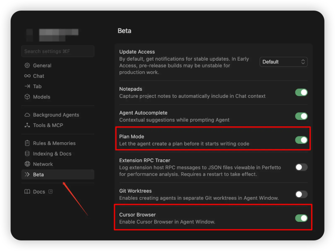 注意目前 Plan Mode 和 Cursor Browser 需要手动开启开关