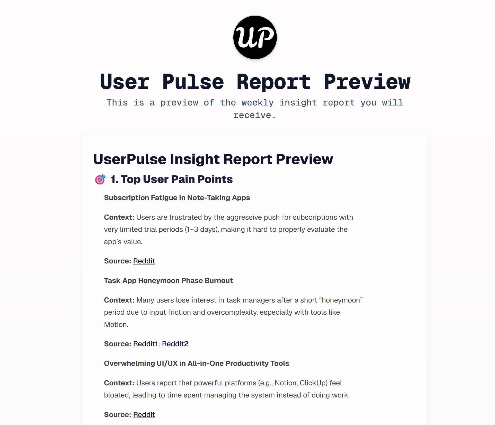 UserPulse是一款轻量级工具,可以扫描社区中的用户反馈和未满足的需求,并将其总结成每周摘要,帮助产品开发者获取用户信号。