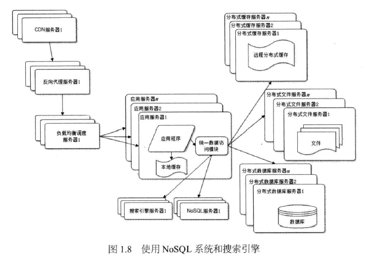 对待不同的数据,有不同的需求,这时候可能就要用到nosql和搜索引擎了。这里我个人并不能确定什么样的场景和数据量才需要使用这些技术,一般的搜索可能就数据库直接完成了。可能会需要加速查询时间,然后有全文搜索的时候需要用到搜索引擎。