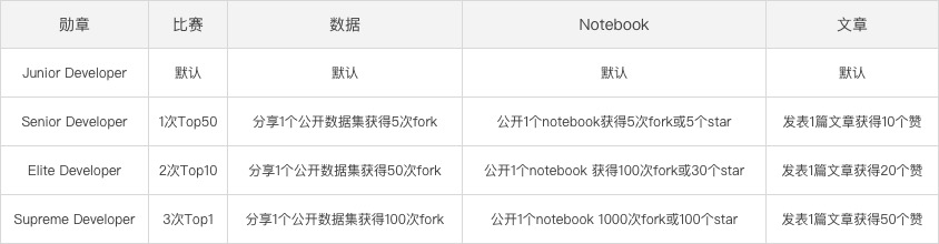 勋章是根据用户在天池平台比赛、数据集、技术圈、天池实验室四个板块的贡献,通过一定规则生成,并在个人主页展示。勋章体现用户在天池的能力与贡献