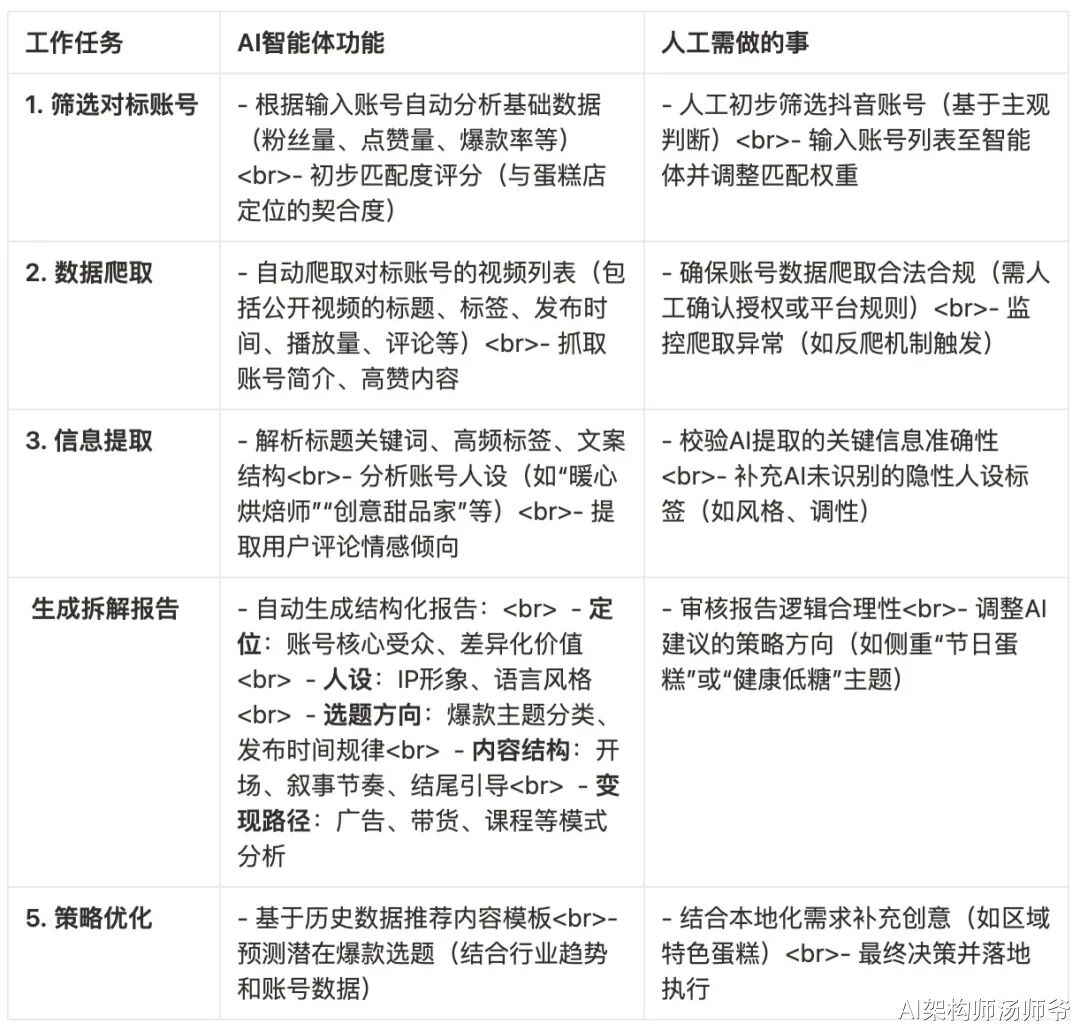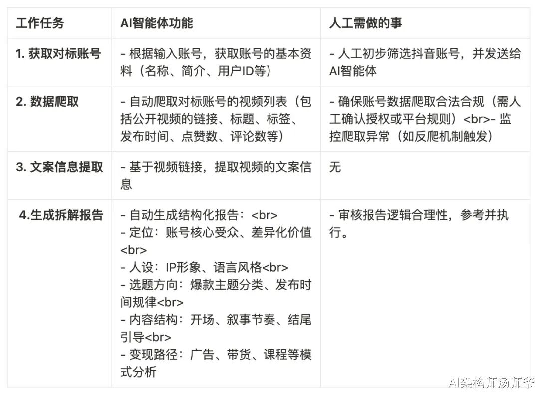 通过DeepSeek的协助,我们清晰地确定了对标账号拆解智能体的核心功能需求。