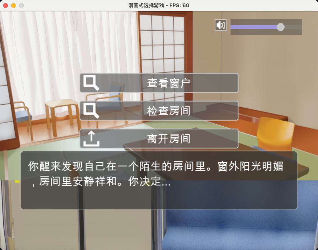 { "scenes": { "start": { "image": "Noraneko_Background_Pack_1/Sitting_Room.png", "text": "你醒来发现自己在一个陌生的房间里。窗外阳光明媚,房间里安静祥和。你决定...", "choices": [ { "text": "查看窗户", "next_scene": "window" }, { "text": "检查房间", "next_scene": "room" }, { "text": "离开房间", "next_scene": "hallway" } ], "background_music": "bg.ogg" } }}