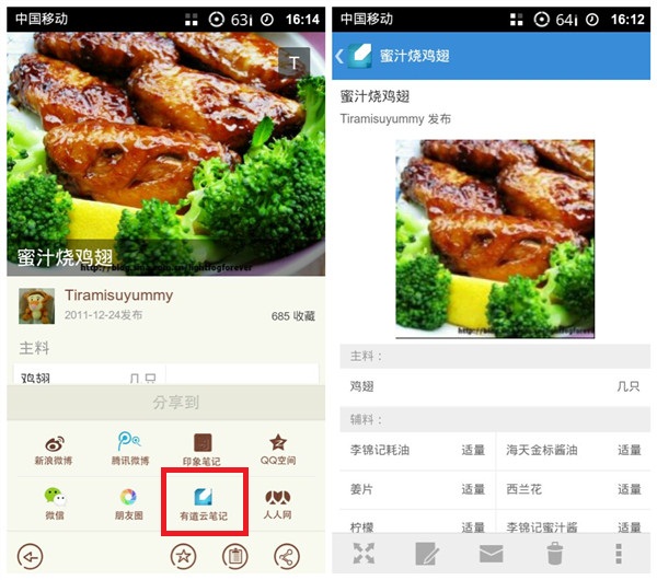 图1 将“豆果美食”中的美食做法分享保存至有道云笔记