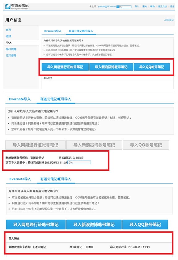 进入页面后,用户可以选择导入自己的其他有道云笔记账号内容。目前提供导入网易通行证账号笔记、新浪微博账号笔记和QQ账号笔记。授权成功后,有道云笔记会提示用户需要导入的账号下笔记的数量及大小。导入成功后,用户可在有道云笔记多个终端查看已导入的笔记内容。
