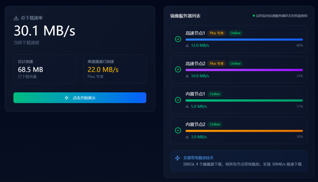 支持国内镜像源(如阿里云、腾讯云)的二次加速,解决部分镜像源速度不稳定问题。